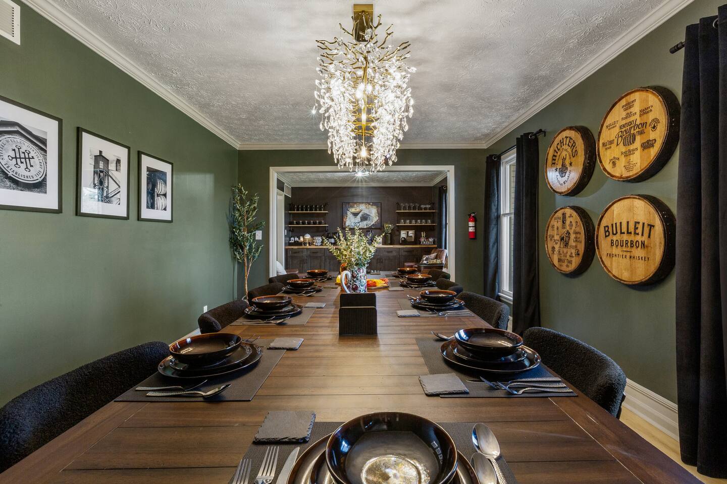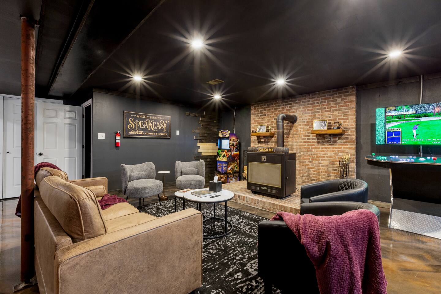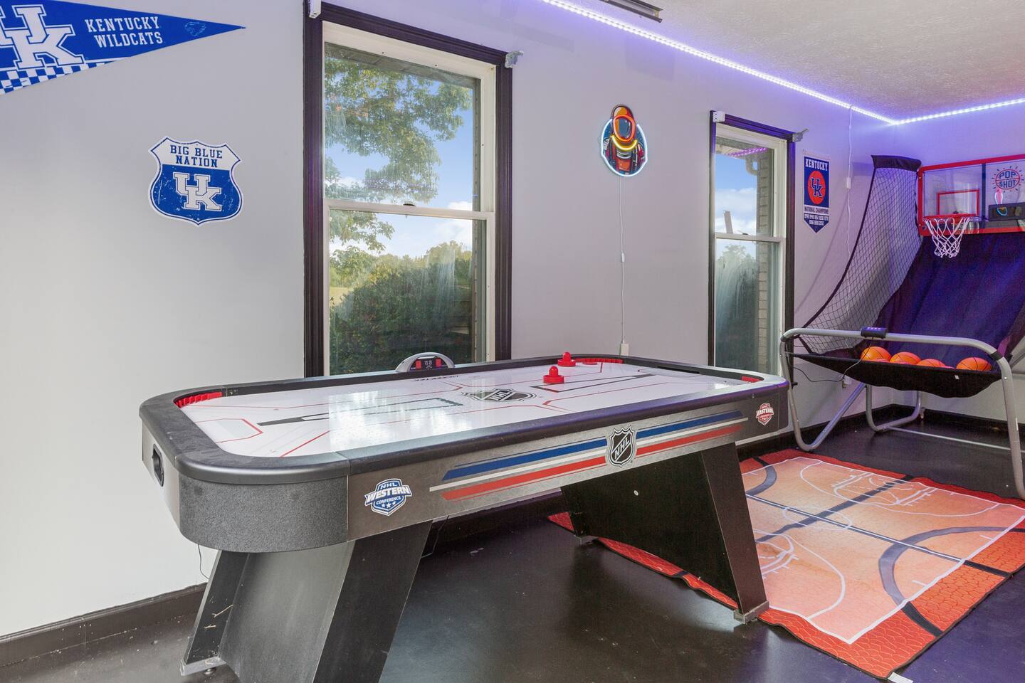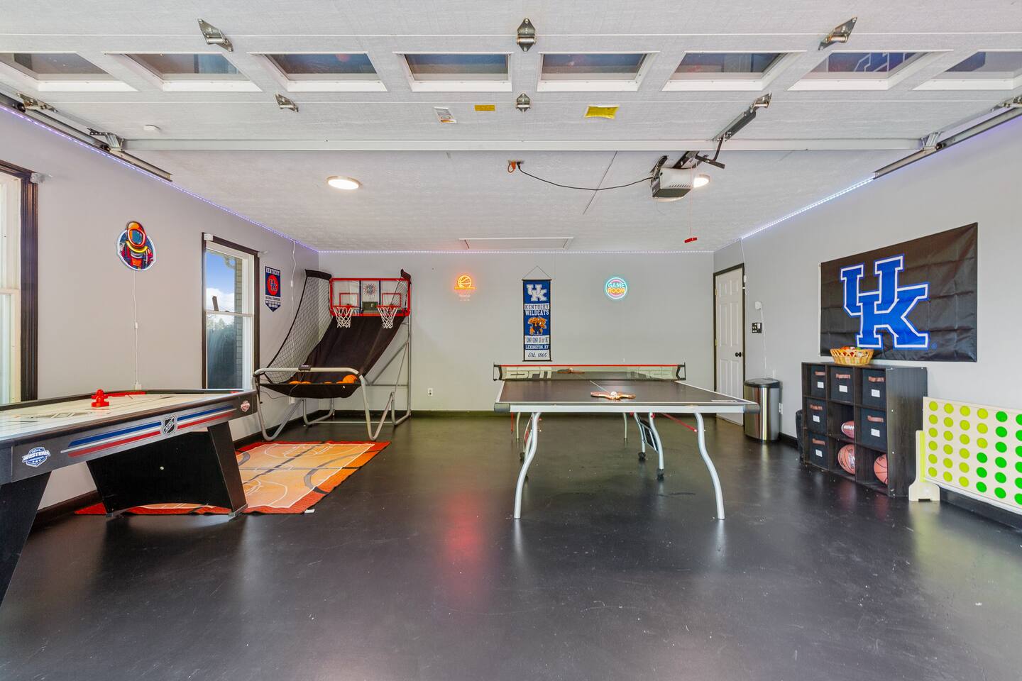 Welcome to Whiskey Business Retreat — your modern Kentucky getaway! ✔ Private 3500 sq ft home on 19 acres ✔ Sleeps 12 ✔ Massive Firepit seats 10 ✔ Covered Hot Tub ✔ In Ground Pool (Seasonal) ✔ Private Speakeasy with BYOB home bar, poker table, billiards, darts, arcade games, & more ✔ Garage Game Room ✔ Close to Buffalo Trace, Whiskey Thief Distilling, & More ✔ Fully Stocked Coffee bar ✔ Dog Friendly Check-in after 3:00pm ET – Check-out before 11:00am ET About The Space: Whiskey Business Retreat is your ideal home base for exploring the Kentucky Bourbon Trail. This spacious vacation rental sleeps up to 12 guests and is designed with comfort and convenience in mind — perfect for families, groups of friends, or bourbon enthusiasts. Enjoy a fully equipped kitchen, family-friendly amenities, and plenty of space to relax after a day of tastings. We’re also dog-friendly, so your four-legged friends can join the adventure. Located just minutes from world-famous distilleries like Buffalo Trace, Whiskey Thief, and more, our retreat combines modern comfort with authentic Kentucky charm. Amenities Guests Love: ➤ Seasonal In-Ground Pool & Covered Hot Tub – Cool off in the pool or unwind year-round in the hot tub, perfectly sheltered for all-weather relaxation. ➤ Private Speakeasy Bar – Mix up the perfect cocktail in our fully stocked bar — just bring the bourbon. ➤ Multiple game tables and over 1000+ classic arcade games ➤ Starter supplies included to make your arrival that much smoother: paper towels, toilet paper, dishwasher pods, laundry pods, shampoo, conditioner, body wash. ➤ Local Insider Guidebook – Explore like a pro with our curated guide to the Bourbon Trail, Buffalo Trace, Whiskey Thief, and local attractions. ➤ Massive Outdoor Firepit – Gather around our 10-seat firepit with friends and family under the Kentucky night sky. ➤ Propane grill with propane included. Front Porch ➤ Relax in the classic rocking chairs on the spacious front porch while enjoying your morning coffee or an evening cocktail. ➤ The porch offers peaceful views of rolling Kentucky fields and farmland, creating the perfect serene backdrop. Kitchen and Dining ➤ Fully Stocked Kitchen – Includes essentials for cooking and baking, even a crock pot, blender, air fryer, waffle maker, and more, plus silverware and dishware for the entire group. ➤ Coffee Bar – Keurig Duo, coffee grounds, K-cups, creamer, sugar, and more for easy mornings. ➤ Dining Table & Seating – Main table seats 10, with 4 additional seats at the breakfast bar and casual seating on the bay window bench. ➤ Starter Supplies – Paper towels, dishwasher pods, sponges, olive oil, and spices are ready for your arrival. ➤ Filtered Water Pitcher – Clean, chilled water available in the fridge. ➤ S’mores & Grill Fun – S’mores sticks and grill utensils included for outdoor cooking adventures. Living Room ➤ Seating for your whole group. ➤ Cozy space with electric fireplace. ➤ 75" Smart TV to log into your own streaming services. ➤ Plenty of games you and your loved ones will enjoy. Speakeasy ➤ Private BYOB Speakeasy with pool table, 10-person poker table, lounge area, and a massage chair for ultimate relaxation. ➤ Fully stocked home bar: mini fridge, ice maker, and all the barware you need to mix your favorite drinks, including a whiskey smoker to make the perfect smoked Old Fashioned. ➤ Arcade fun: Buck Hunter and a 4-person gaming console with over 1,000 classic arcade games! ➤ 2 dart boards for friendly competition. Garage Game Room ➤ Pop-a-Shot, Air Hockey, and a Ping Pong Table Outdoor Space ➤ Seasonal In-Ground Pool ➤ Massive firepit with seating for 10 ➤ Covered 5-person Hot Tub on back patio with seating ➤ 2 acres of fenced yard ➤ Adjustable Goalrilla Basketball Hoop in the driveway ➤ Golf Hitting Net ➤ Propane Grill with Propane Tank included ➤ Al Fresco Dining, chaise lounge chairs, and a daybed to relax on ➤ Pickleball Court ➤ Yard Games like bucket golf, lawn darts, cornhole, and more! Sleeping Accommodations & Bathrooms: Every bedroom comes ready for your stay with luggage racks, laundry baskets, hangers, and shelves for easy organization. Bathrooms are stocked with shampoo, conditioner, body wash, toilet paper, makeup towels, and hairdryers—and if you forget something, check the drawers; we’ve likely got you covered! Primary Suite ➤ Comfortable King bed with the loved Helix Hospitality mattress ➤ Soft sheets and comfy pillows ➤ Extra blankets ➤ Room darkening curtains that keep the room dark as needed ➤ 65-inch Smart TV and electric fireplace ➤ Mini Coffee Bar ➤ En Suite with large walk-in shower and large vanity Guest Bedrooms #1 & #2 ➤ Each has Queen Beds with Helix Hospitality mattresses ➤ Soft sheets and comfy pillows ➤ Extra throw blankets available ➤ 55” Smart TVs ➤ Room darkening curtains that keep the room dark as needed ➤ Bedroom #2 also has a workspace, perfect for catching up on work Guest Bedroom #4 (Basement) ➤ Two king beds featuring the loved Helix Hospitality mattress ➤ Soft sheets and comfy pillows ➤ Extra throw blankets available ➤ Room darkening curtains that keep the room dark as needed ➤ 75” Smart TV and electric fireplace Extra Sleeping Space: The living room can accommodate up to 2 additional guests on the provided queen air mattress. Extra Sleeping Space for Dogs: The master closet has 2 dog beds for your furry companions to enjoy. Extra Sleeping Space for Infants/Toddlers: The master closet has a pack n play stored inside. We recommend bringing your own sheets. Bathrooms ➤ Master En-Suite Bathroom – Large vanity and walk-in shower with all toiletries provided. ➤ Upstairs Hall Bathroom – Large vanity, shower/soaking-tub combo, full toiletries, plus bath salts and bath bombs for a relaxing soak. ➤ Basement Bathroom – Updated vanity and walk-in shower with all es